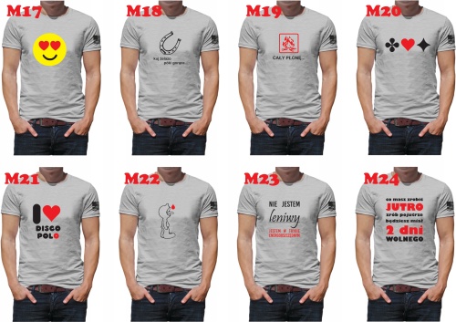 (dotyczy kolorów wzorów, np. na koszulce czarnej wykonujemy napis "I love disco polo" w kolorze biało-czerwonym, a na koszulce np. czarnej "I love disco polo" będą w kolorze czarno-czerwonym itp., ewentualne sugestie prosimy zawierać w okienku wiadomość dla sprzedającego)