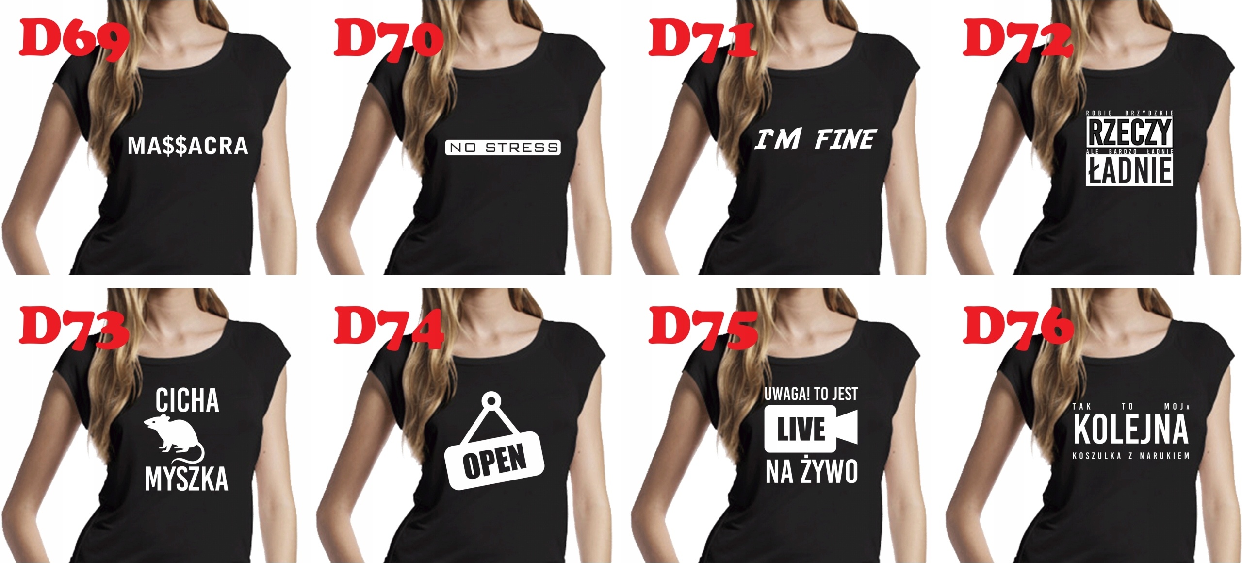 Wybierając model D100 po zakupie prosimy o podanie tekstu i jego koloru oraz kolor koszulki lub zapraszamy do kreatora online (link poniżej).