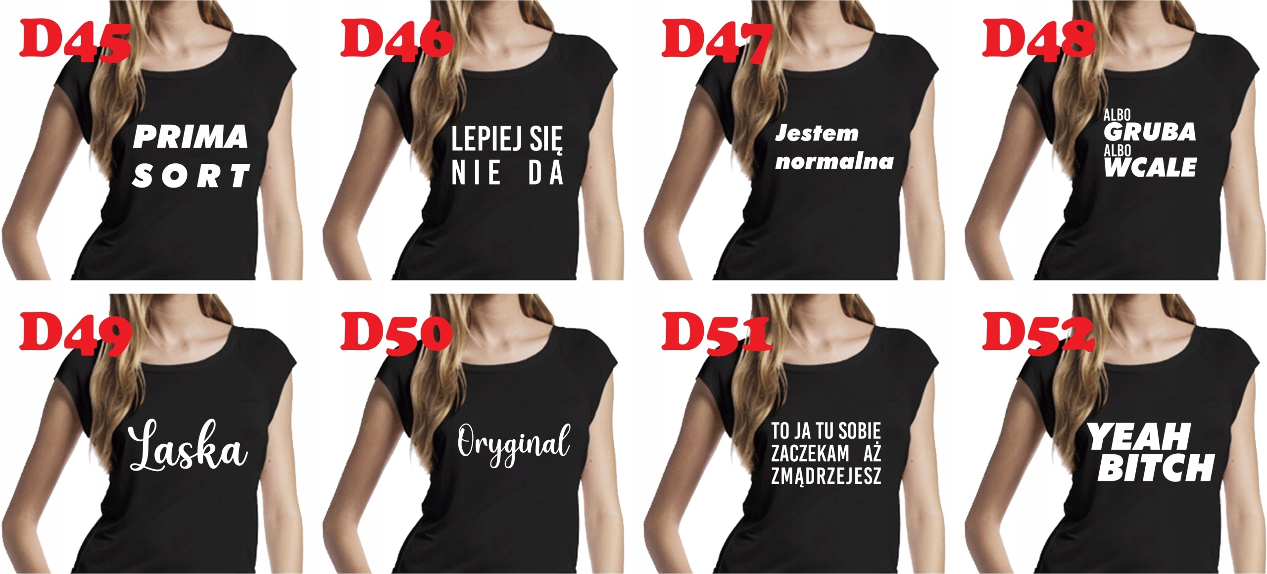 Wybierając model D100 po zakupie prosimy o podanie tekstu i jego koloru oraz kolor koszulki lub zapraszamy do kreatora online (link poniżej).