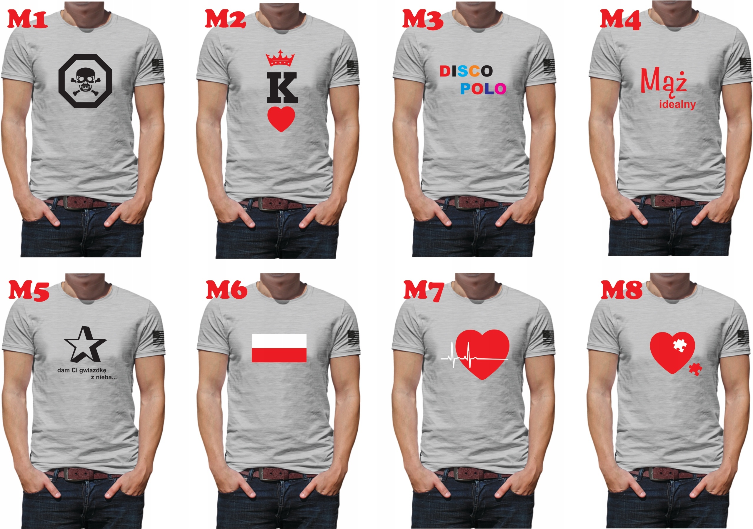 Wybierając model M100 po zakupie prosimy o podanie tekstu i jego koloru oraz kolor koszulki lub zapraszamy do kreatora online (link poniżej).