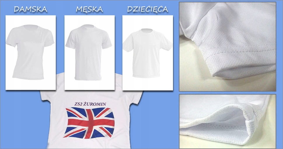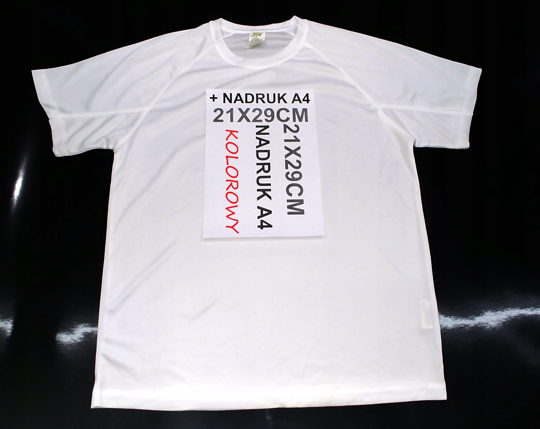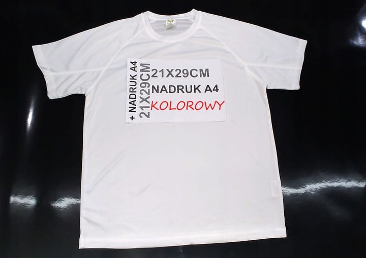 Koszulka T-SHIRT poliestrowa biała z Twoim dowolnym kolorowym nadrukiem A4 z przodu.