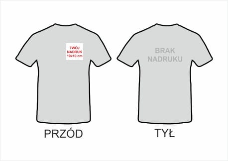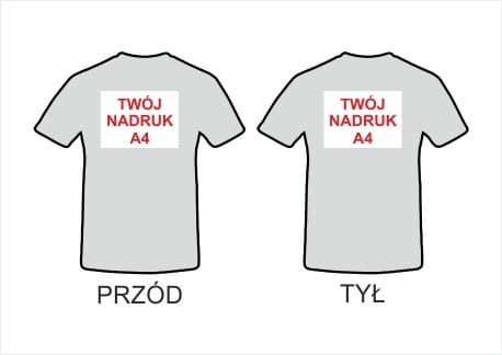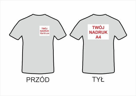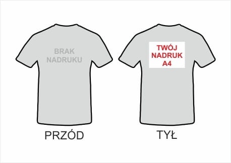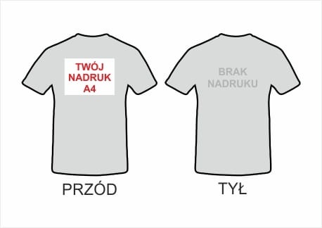 Na koszulce wykonujemy dowolny kolorowy jednostronny nadruk w formacie maksymalnie A4 (21x29cm) w pionie lub poziomie. Nadruk jest niewyczuwalny i trwały wykonany metodą sublimacji (kolorystyka CMYK) . Nadruk może byc umieszczony z tyłu lub z przodu koszulki